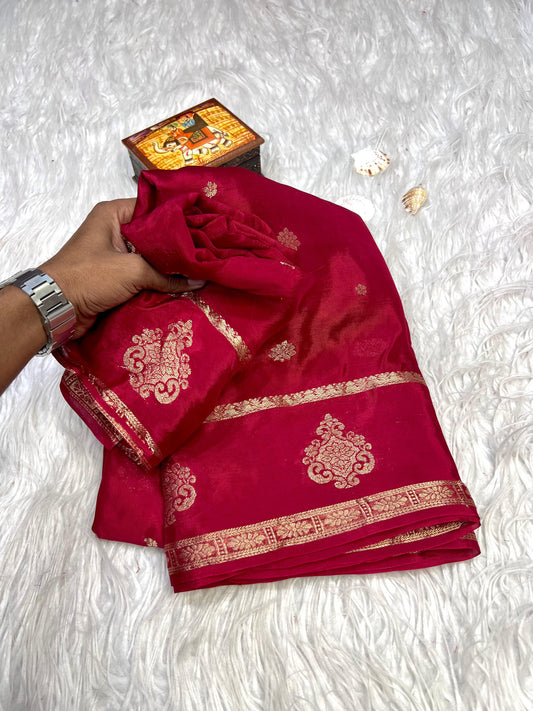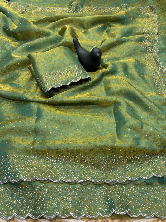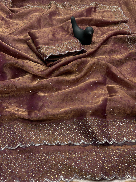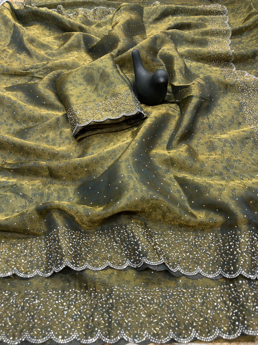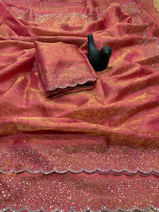 Fandy satin saree with self weaving zari pattern in body with all over siroski border and running blouse with siroski bord