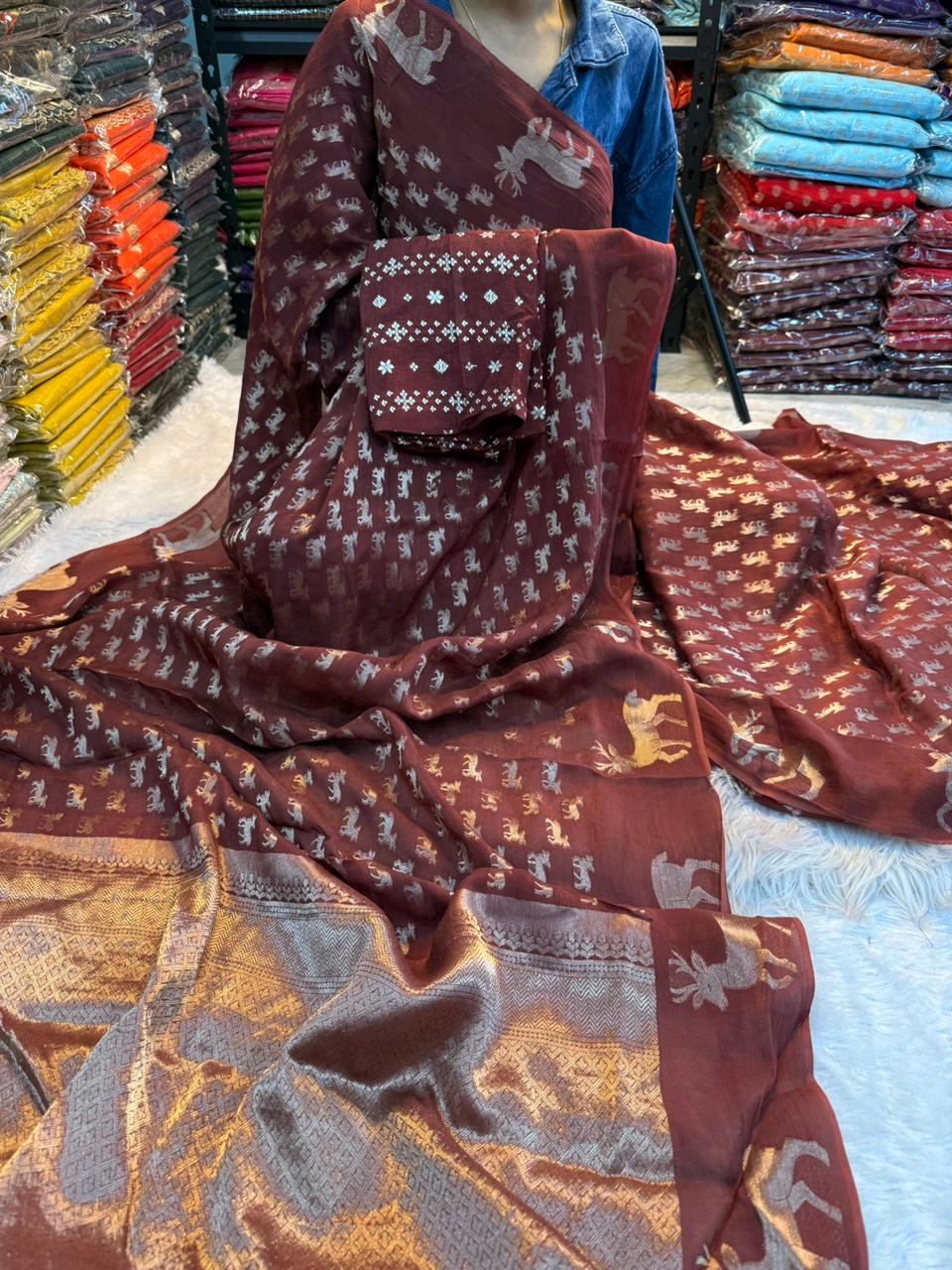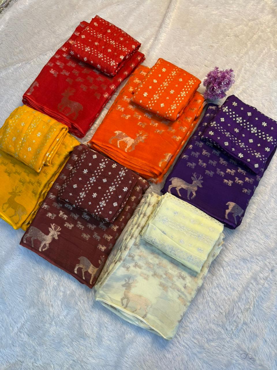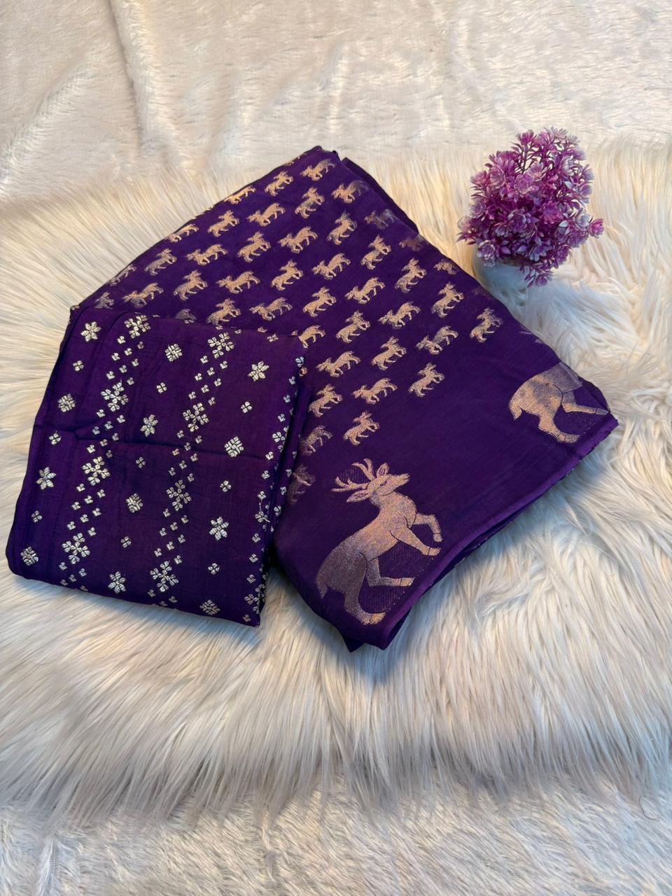 Pure soft Viscose dola Crepe silk fabric chit pallu saree with cow zari border pattern and with viscose dola blouse 2D concept saree