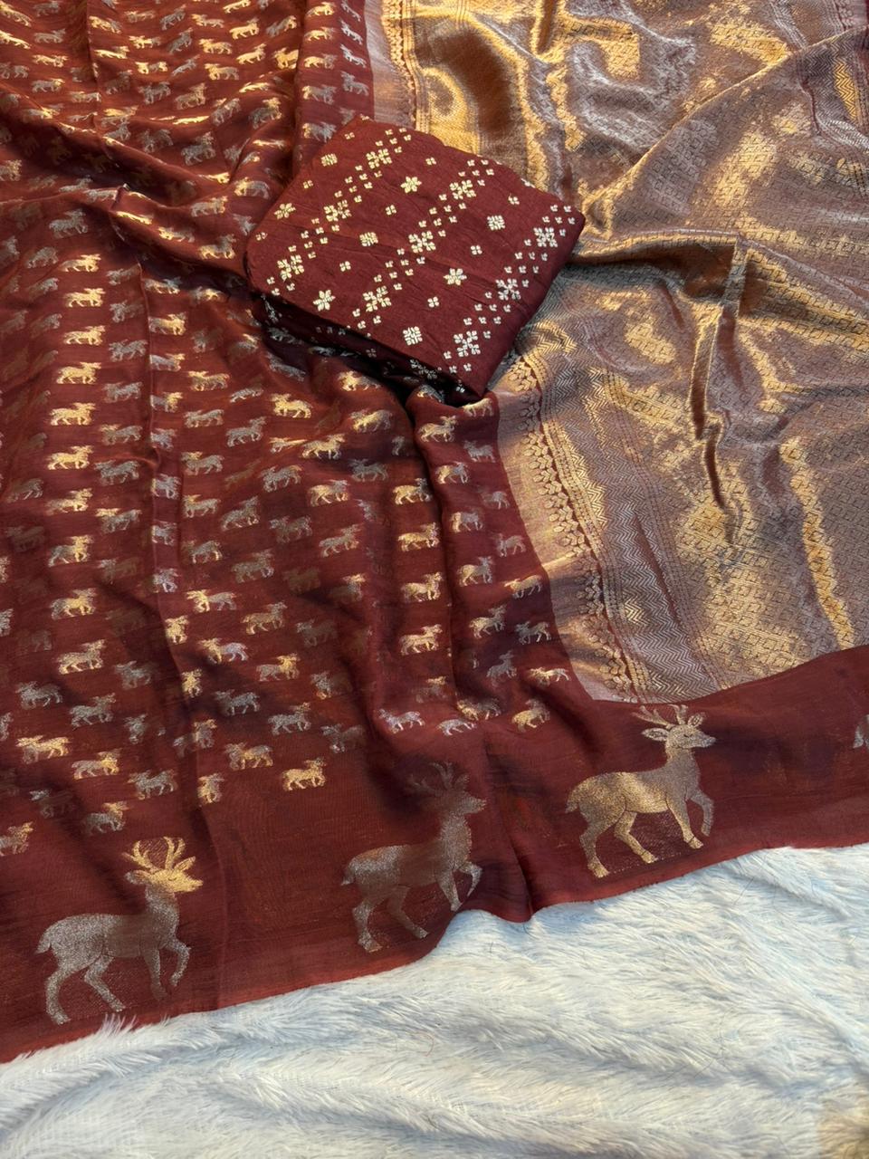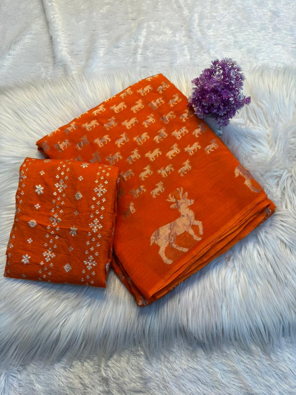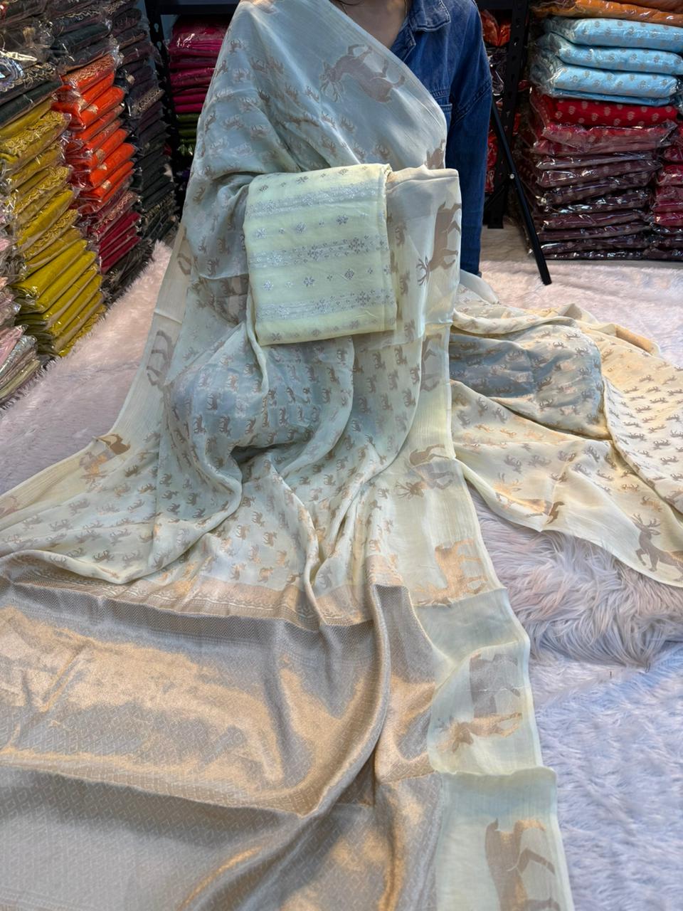 Pure soft Viscose dola Crepe silk fabric chit pallu saree with cow zari border pattern and with viscose dola blouse 2D concept saree